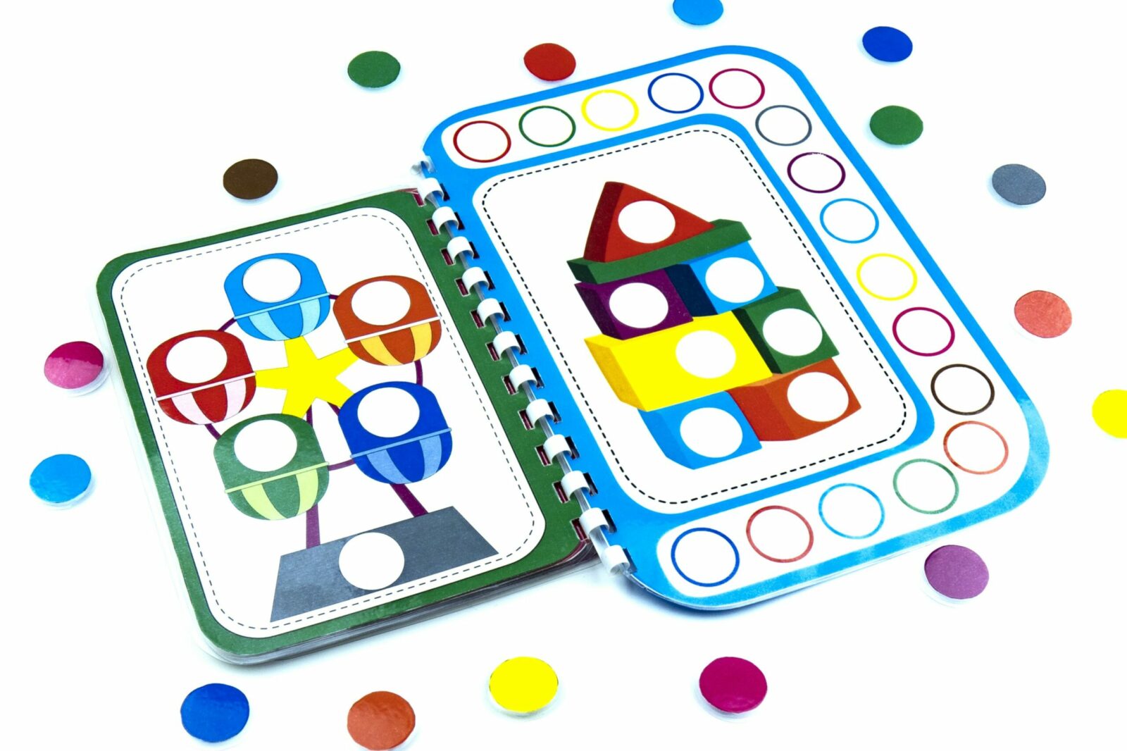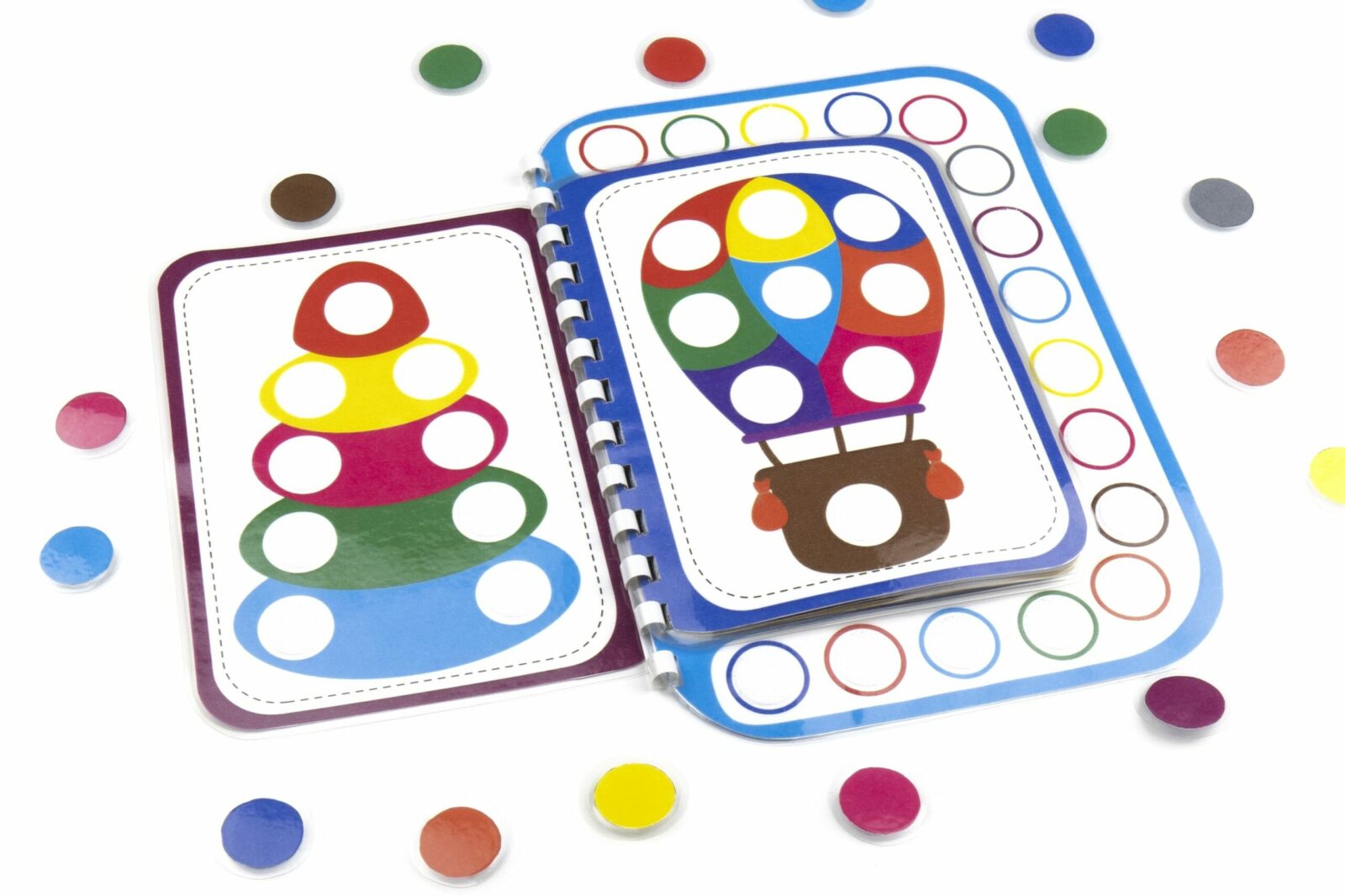 Duża strona bazowa z „domkiem” na kolorowe kropki stanowi wspaniałe tło do zabawy i nauki. Dziecko może ćwiczyć umiejętność rozpoznawania kolorów, umieszczając kółeczka na odpowiednich miejscach na bazie.